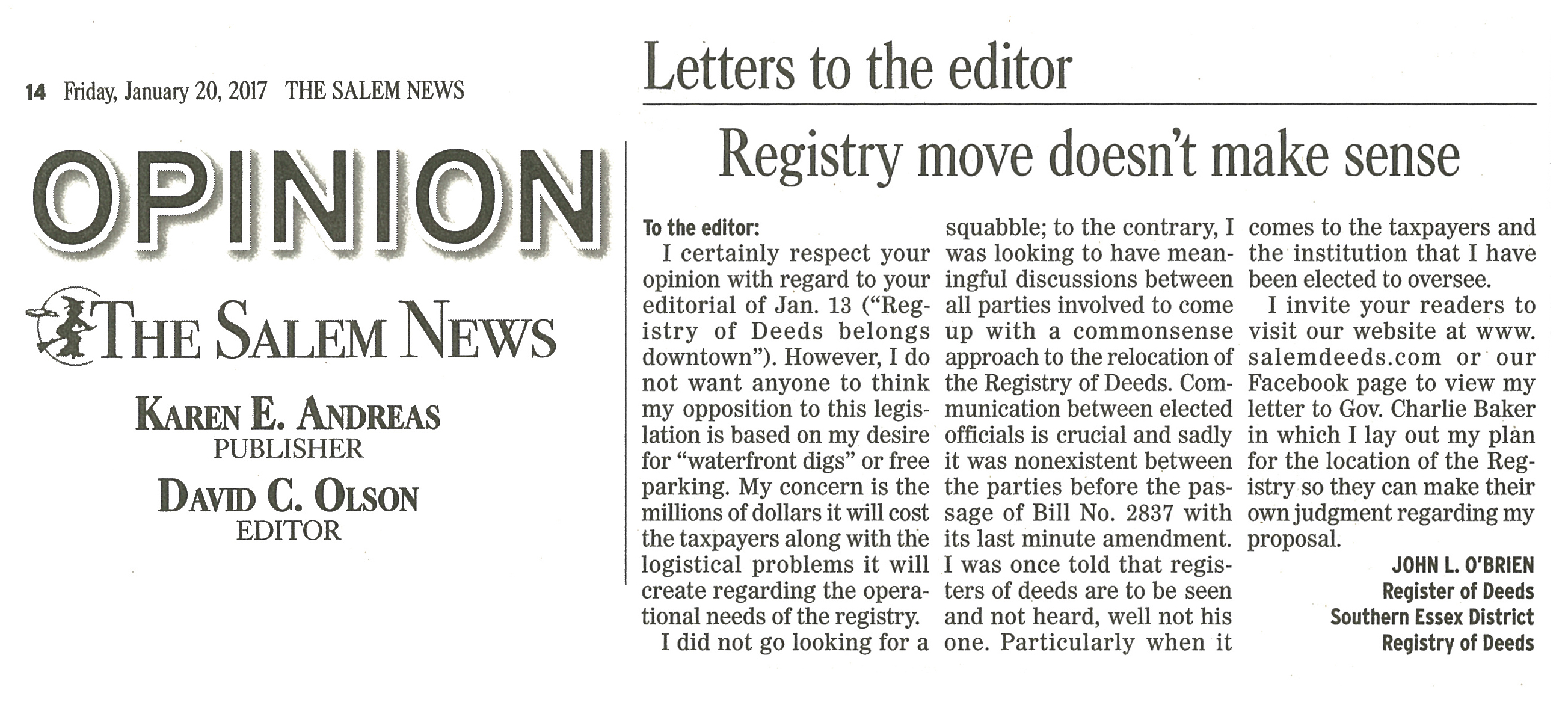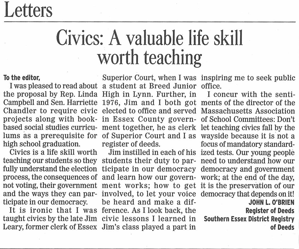 2000: Register John O’Brien receives the National Association of County Recorders Election Officials and Clerks “Public Official of the Year” award for the Registry’s innovative use of technology to better service his constituents. "O'Brien Brings Registry Office into High-Tech Age. Awarded "Public Official of the Year" by the National Association of County Recorders and Clerks." Lynn Item. "Registries Seeking to Bring Online Records to the Public." Southern Essex ROD Internet Site a Nationally Recognized Model; Plans to test paperless transactions considered. Banker & Tradesman. http://www.thewarrengroup.com Editorial: "Looking Ahead to e-filing." Massachusetts Lawyers Weekly, December 2000. "County Registry of Deeds Pioneers Electronic Filing." Lynn Item, October 18, 2000. "Southern Essex Registry of Deeds Tests Electronic Signatures." Banker & Tradesman, October 9, 2000